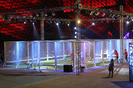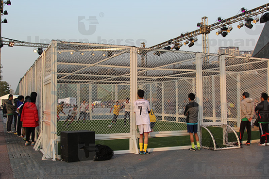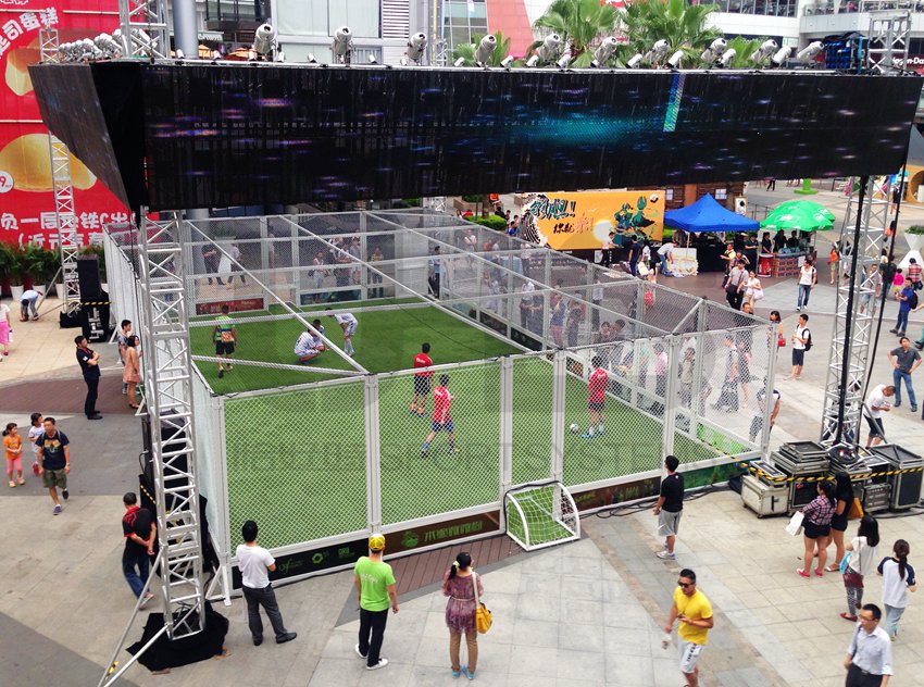 深圳市移动式铁笼型笼式足球场为客户定制型的3人小型足球场,效仿耐克的铁笼足球赛采用全封闭设计,球员可畅快淋漓地在场内享受花式足球的技巧。该场地是可移动式,能适用于许多场合。包括举行竞技比赛、商业活动等。