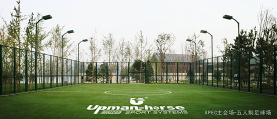 北京市APEC主会场五人制足球场位于2014年北京APEC会议主会场,地点在北京怀柔雁栖湖。地处燕山脚下,北临雄伟的万里长城,南偎一望无际的华北平原,是一处风光旖旎的水上乐园。场地采用全铝合金组合式围网设计,不设边界,球遇围网可反弹。配备8个球场灯柱。