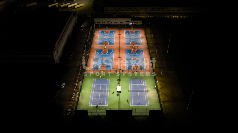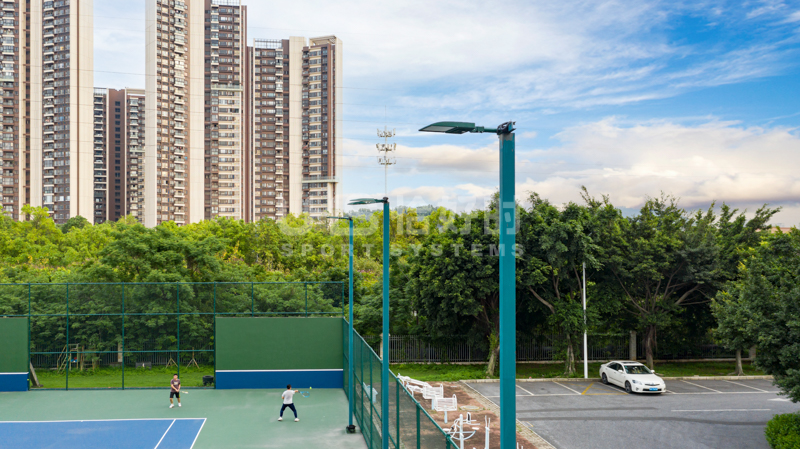 公司网球场和篮球场的照明系统由明利亚照明体育系统担当、网球场地面则选用了TOPLUS托柏斯水性运动场材料系统;